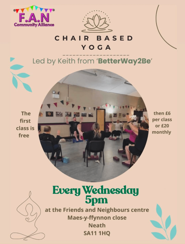 Wednesday is in partnership with Friends and Neighbours Community Alliance (FAN) and is at the FAN Centre, Mas-y-ffynon Close. First class is free.